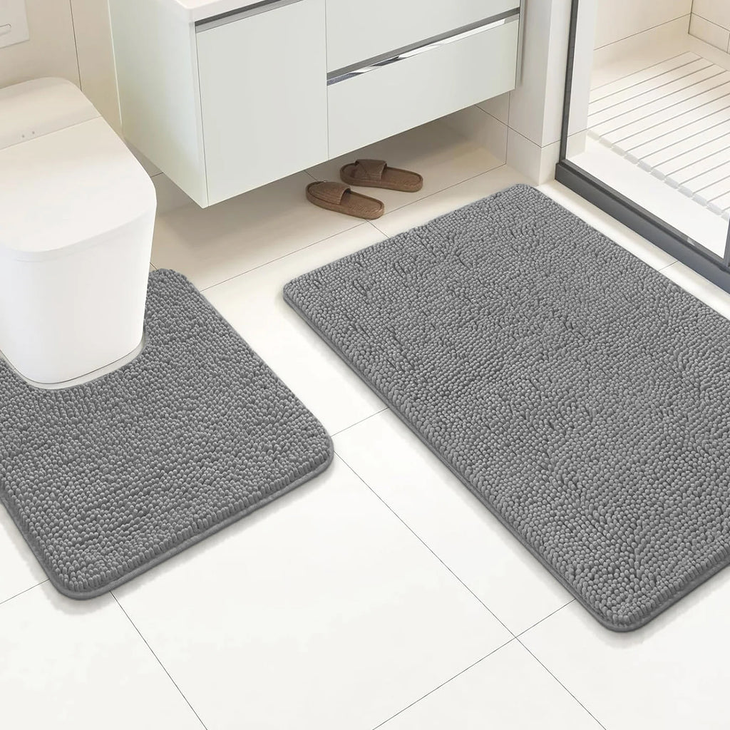 2 Piece Set Dark Grey Soft Cozy Plush Chenille Bath Mat Bathroom Rug