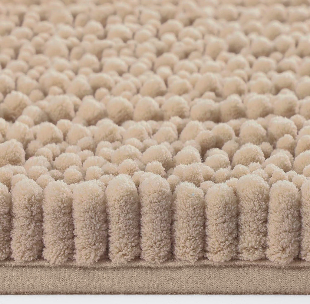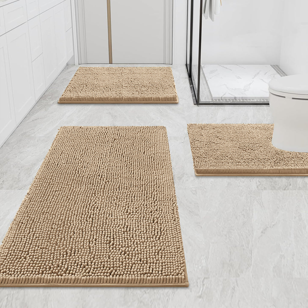 3 Piece Set Beige Soft Cozy Plush Chenille Bath Mat Highly Absorbent Bathroom Rug