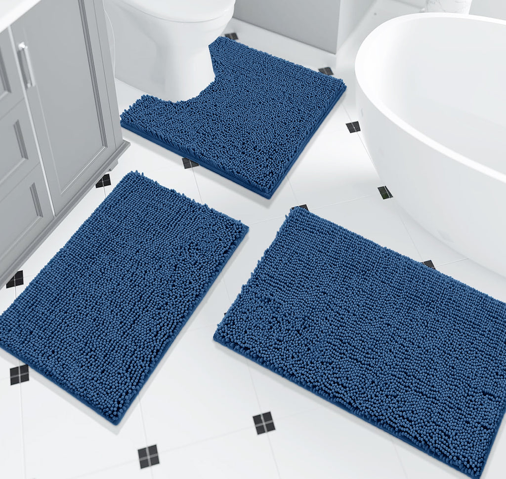 3 Piece Set Blue Soft Cozy Plush Chenille Bath Mat Highly Absorbent Bathroom Rug