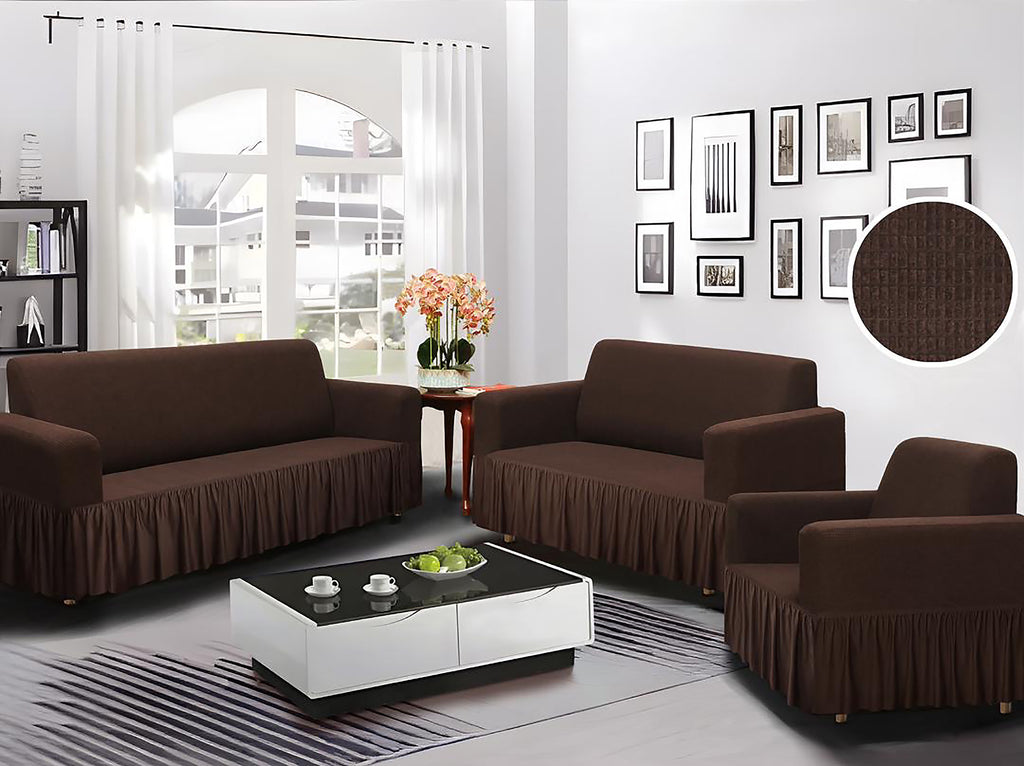 Chocolate Brown 3-Piece Set 4-Way Stretch Ruffled Skirt Slipcover Sofa Loveseat & Armchair Cover Protector